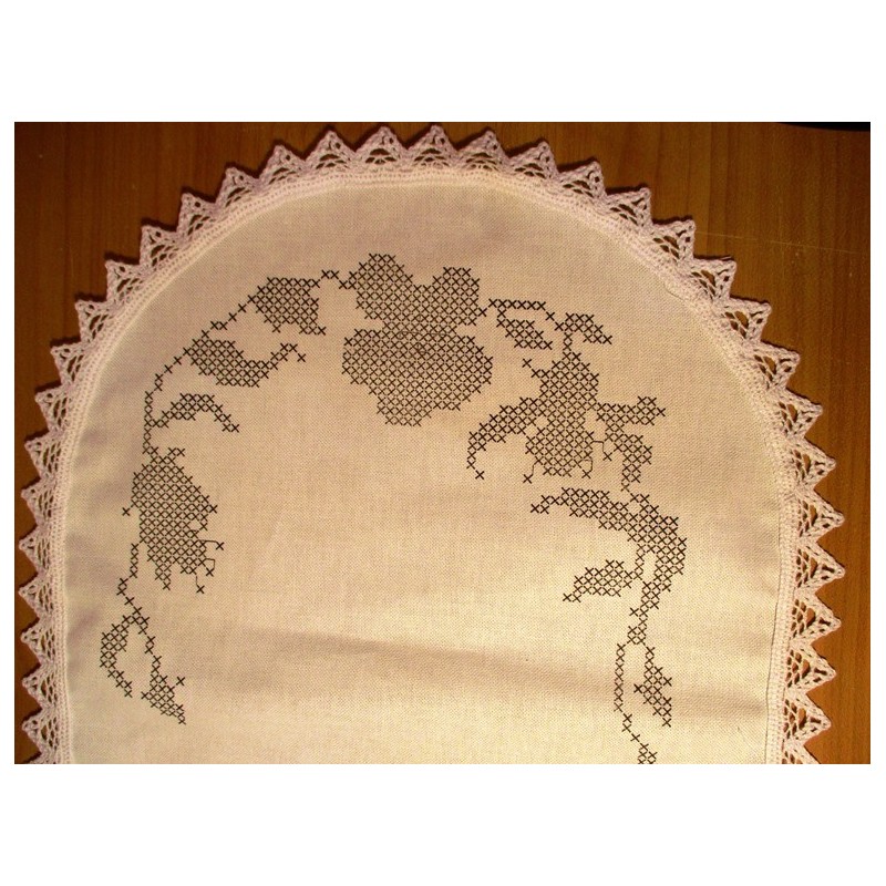 Csipkével szegett elõfestett terítõ, melyet keresztszemes technikával hímezhet ki.