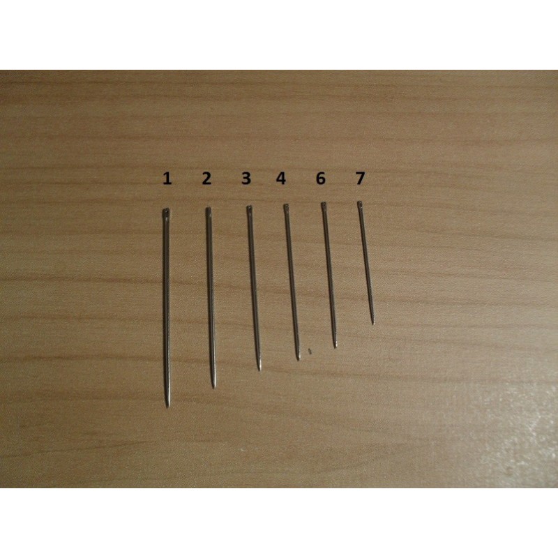 Hegyes acéltű kézi varráshoz kifejlesztve. A számozás a mérettel ellentétesen megy, tehát az 1-es a legnagyobb.